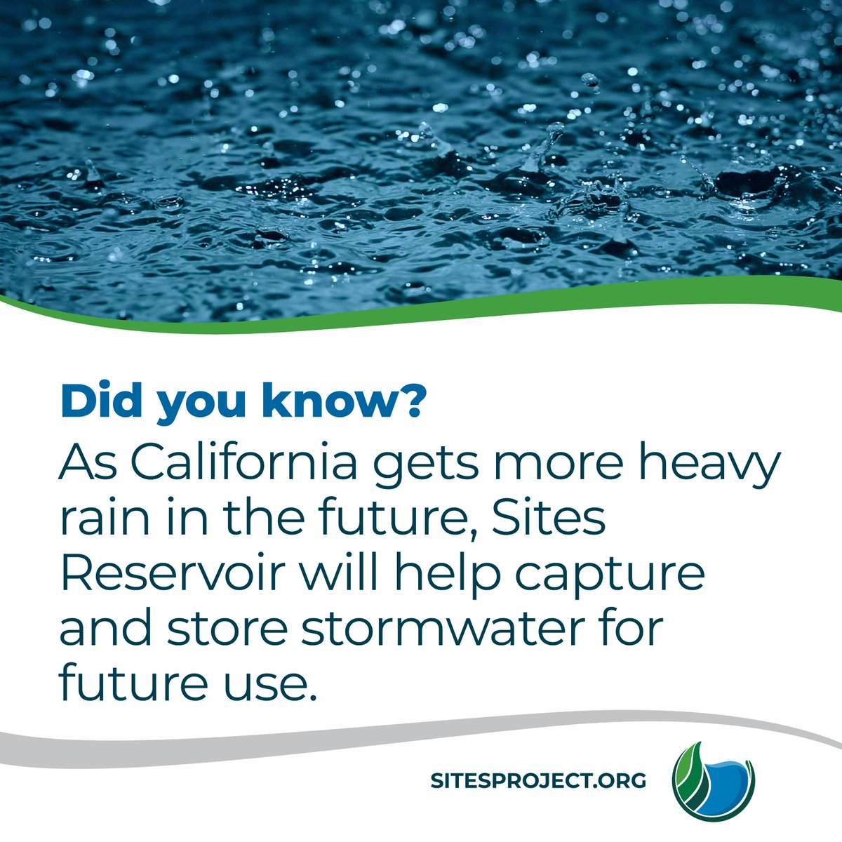 Did you know Sites Reservoir is designed as a rain-fed reservoir? As California gets more intense rainstorms, Sites Reservoir will capture and store a portion of high river flows to use during dry years.